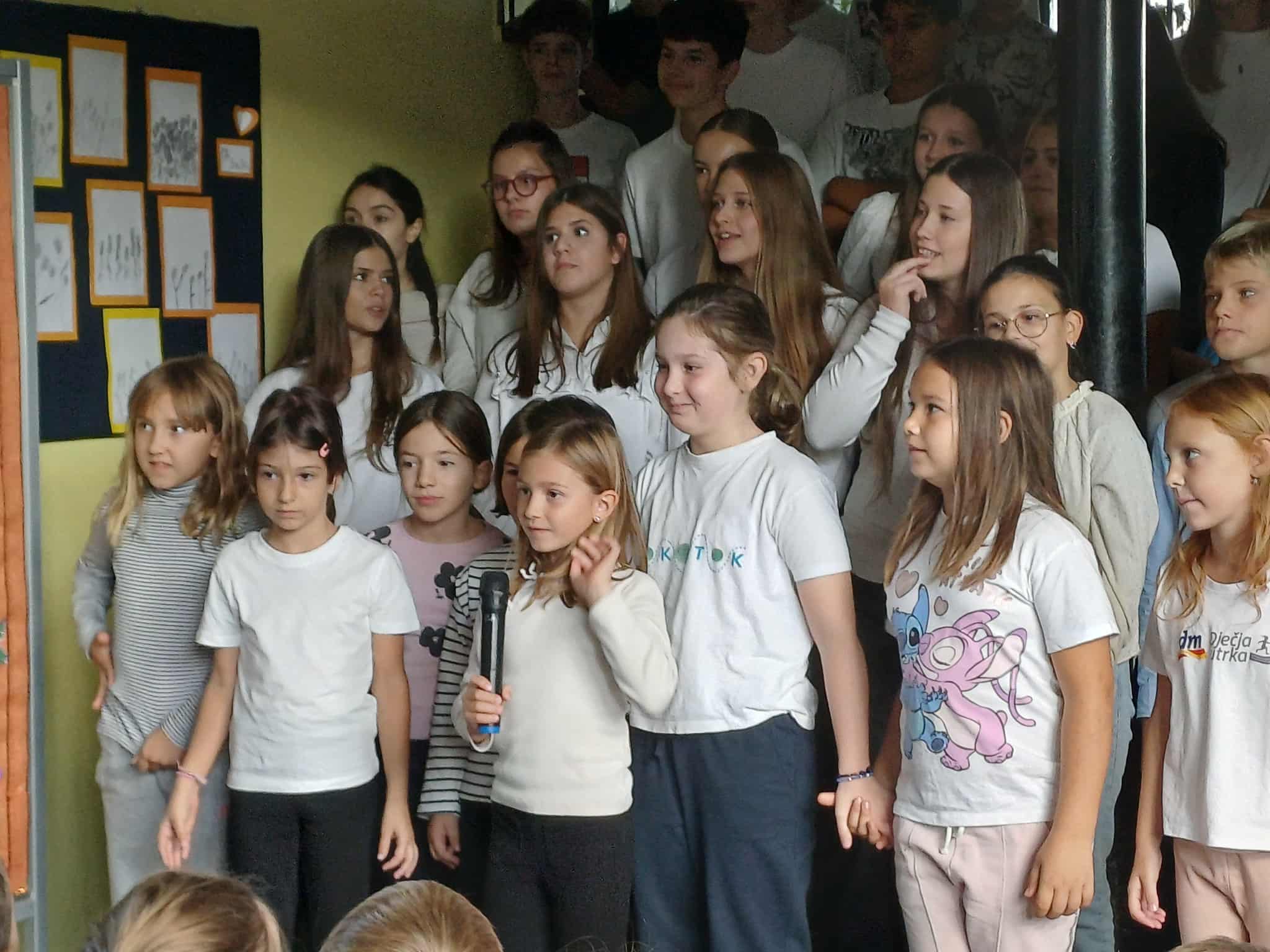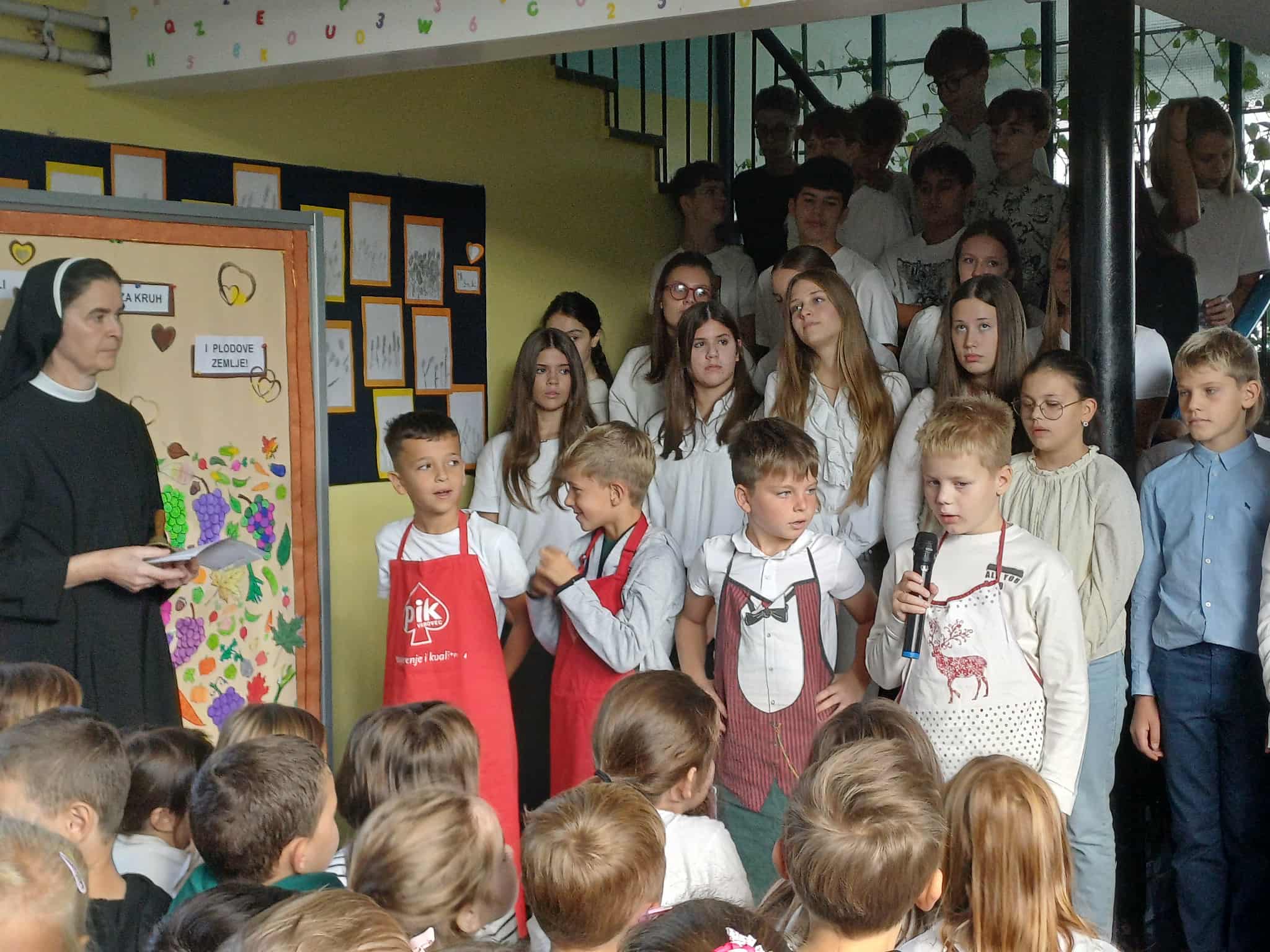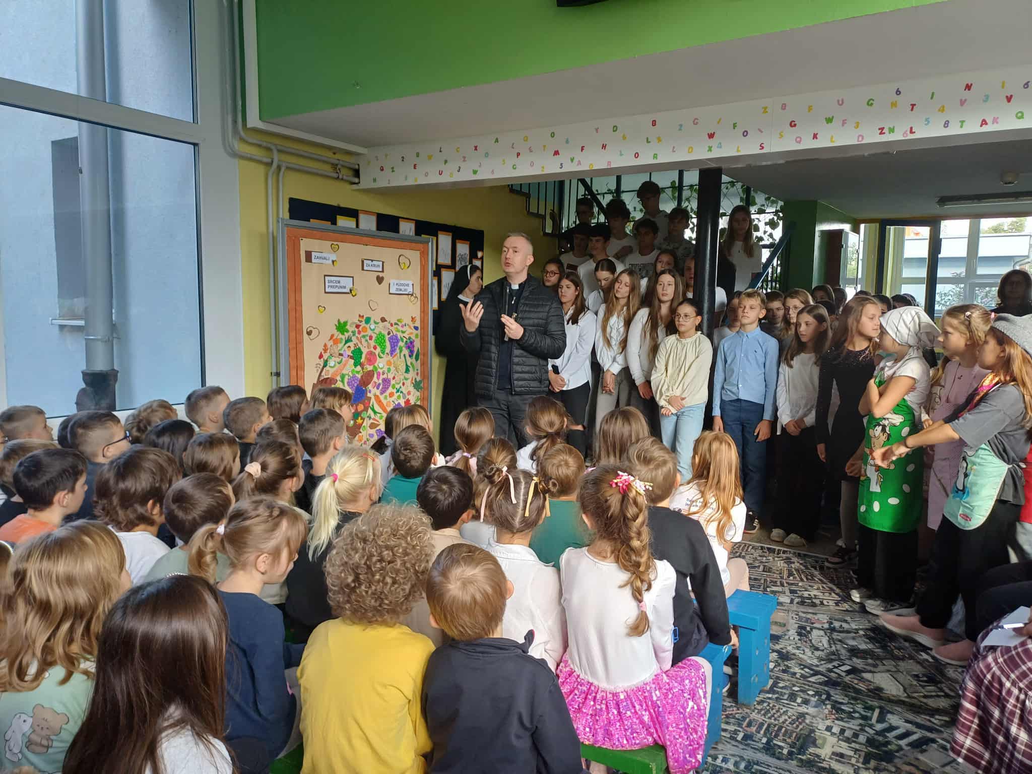 Na početku priredbe, pod vodstvom s. Mare, pjesma naših radosnih i raspjevanih osmaša i petaša odjekivala je iz njihovih mladenačkih srdaca prostorima škole. Pjesmom su zahvaljivali Bogu za svu dobrotu koju nam daje i slavili Krista, svoga Prijatelja i Učitelja. Učenici su pod vodstvom učiteljice Marite Škanata i vjeroučiteljice Violeta Raguž izveli predivne recitacije i tako nas potaknuli i pozvali na dobrotu i zahvalnost Bogu i čovjeku. Uslijedila je zajednička pjesma „Mi želimo uzdić Isusa“ koju smo svi zapjevali uz pokrete a koje je učenike naučila vjeroučiteljica Violeta.